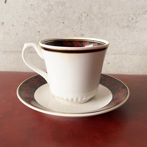 ノリタケによって製造された「アルマンド」シリーズのデザインをベースにしていると考えられます。白いカップに金色の縁取りと、黒と赤の唐草模様(からくさもよう)のデザインが特徴です。